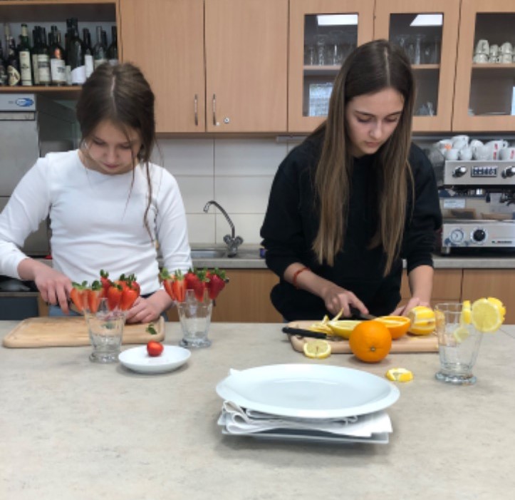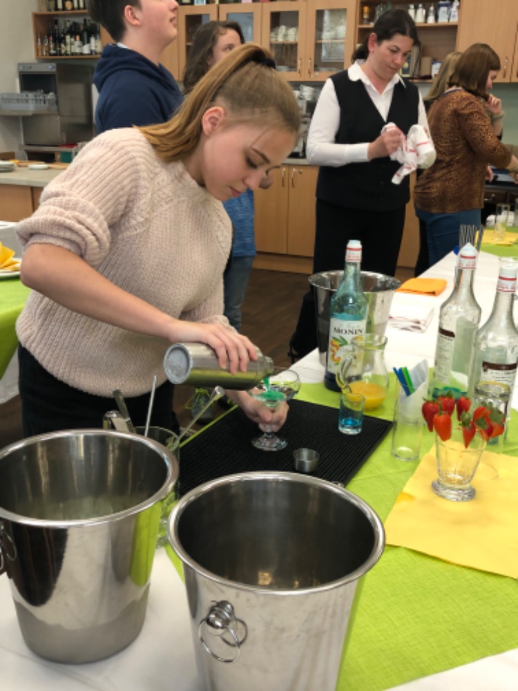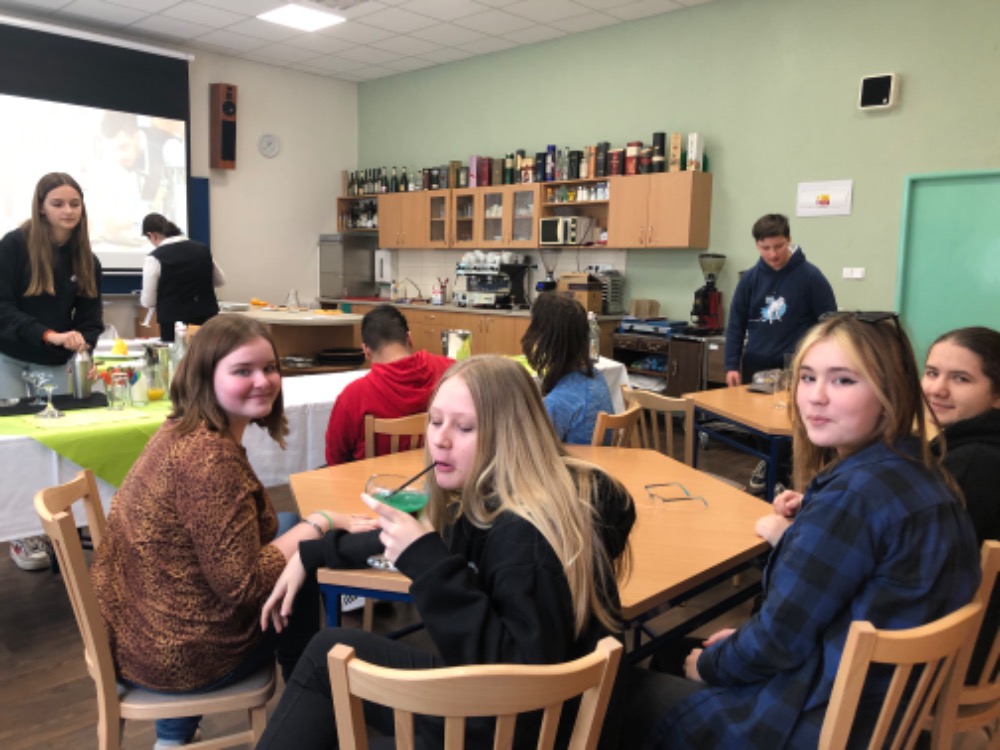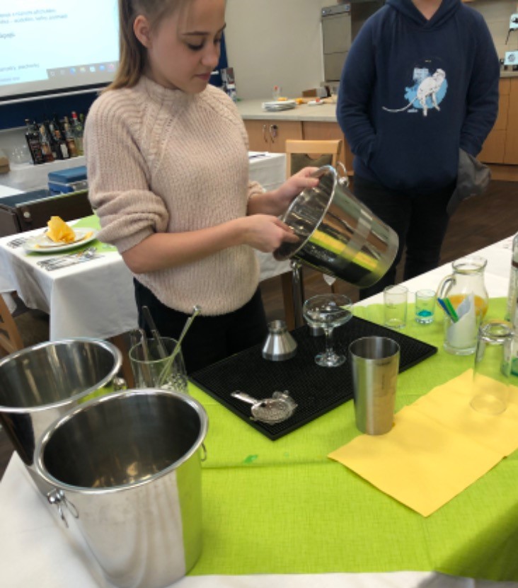 Žáci nejdříve zhlédli video z barmanské soutěže. Potom si každý připravil míchaný nápoj z dostupných ingrediencí. Aktivní zapojení všech a nadšení pro práci můžete posoudit na přiložených fotografiích N. Halouskové.